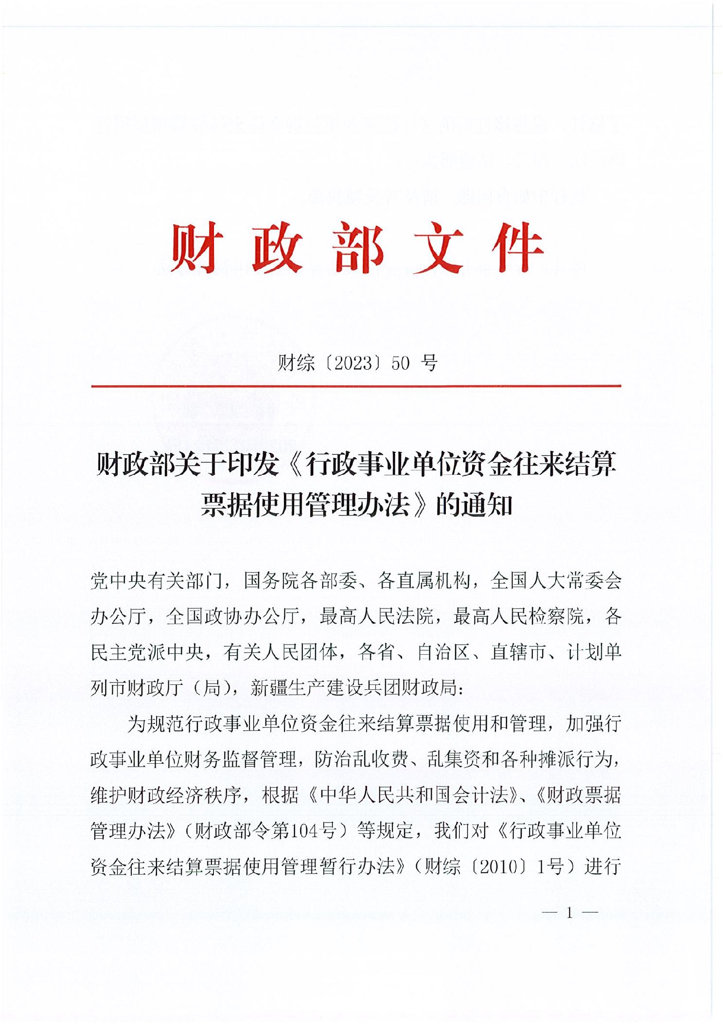 为进一步规范行政事业单位资金往来结算票据使用和管理,加强行政事业单位财务监督,防治乱收费、乱集资和各种摊派行为,维护财经秩序,财政部修订印发了《行政事业单位资金往来结算票据使用管理办法》(财综〔2023〕50号)。为了严格落实财政部和市财政局关于行政事业单位资金往来结算票据使用管理相关要求,现将财政部修订后的《行政事业单位资金往来结算票据使用管理办法》予以转发,请遵照执行。