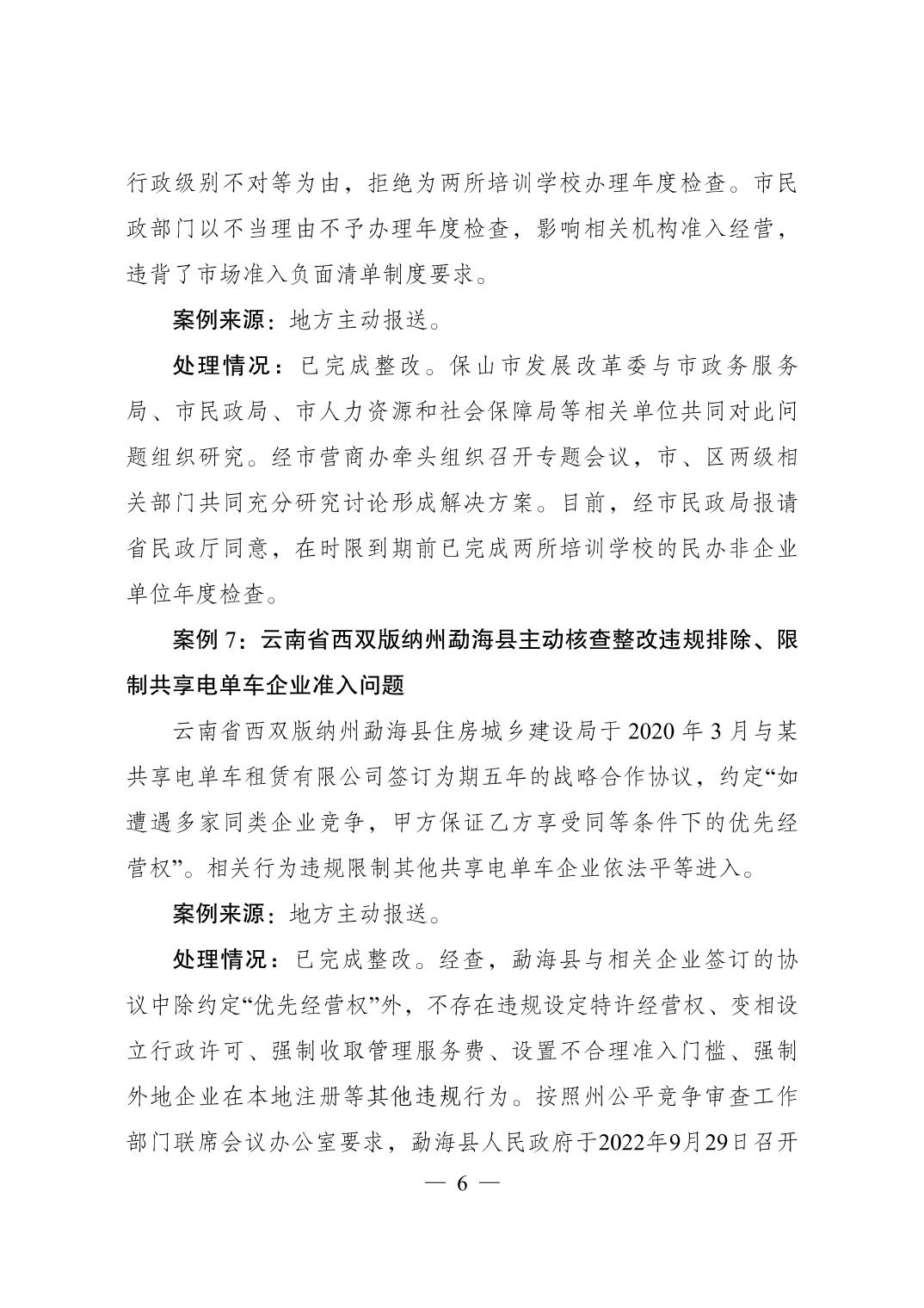 按照国务院有关工作部署和《国家发展改革委关于建立违背市场准入负面清单案例归集和通报制度的通知》(发改体改〔2021〕1670号)要求,国家发展改革委会同有关部门、地方发展改革委对违背市场准入负面清单情况开展第六批排查清理,现对案例及处理情况进行通报。在本期案例归集工作中,福建、云南省发展改革委及福建省福州市、漳州市,云南省玉溪市、保山市、西双版纳州充分发挥市场准入效能评估试点工作优势,对照市场准入壁垒情况和此前通报案例,积极开展案例自查整改报送,切实为企业解决准入难题,取得良好成效,在此予以表扬。山东省发展改革委和山东省菏泽市亦主动报送了案例并整改完成,一并予以表扬。请各地区、各部门对照通报所列案例自查自纠,认真学习有关经验做法,充分发挥工作机制作用,切实解决经营主体准入困难问题,在不断优化市场准入环境方面创造更多管用可行的举措经验。