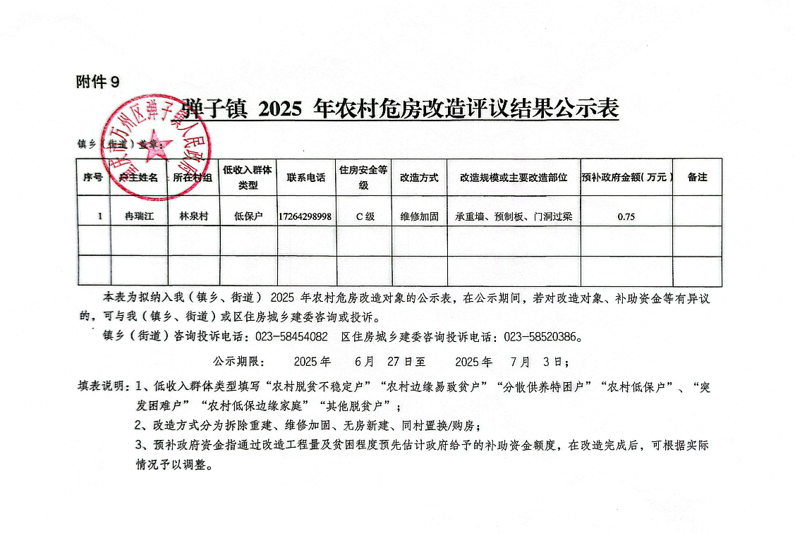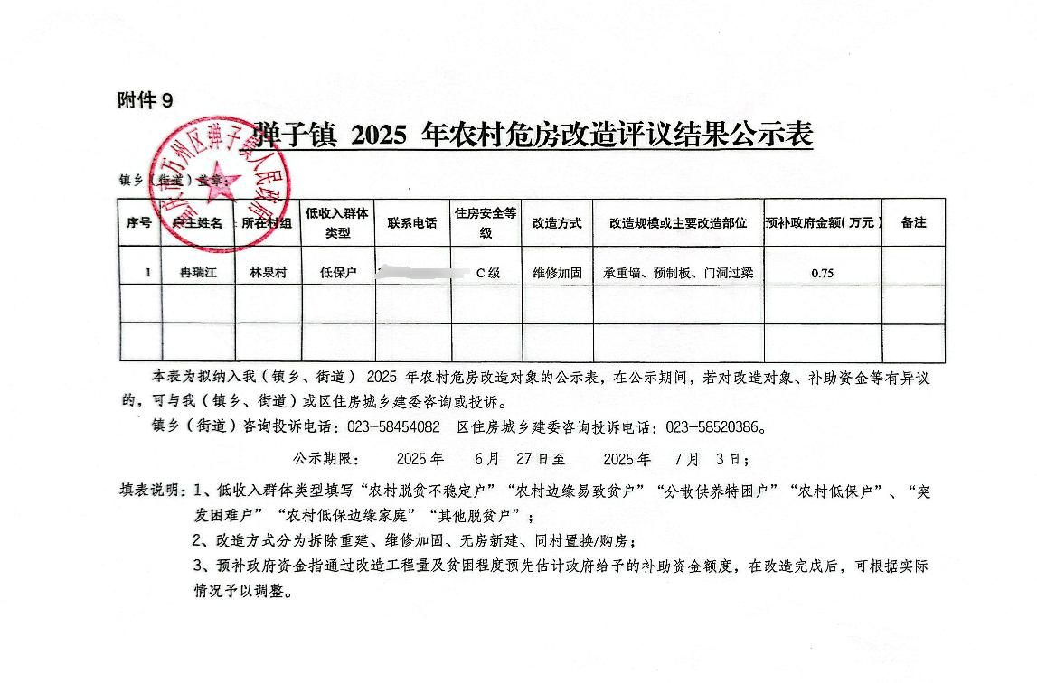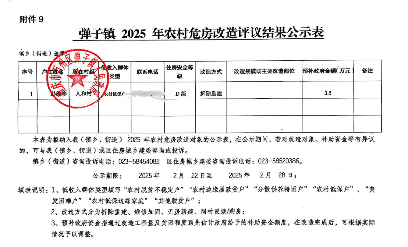 在线博彩平台 弹子镇2025年农村C(D)级危房改造评议结果公示表