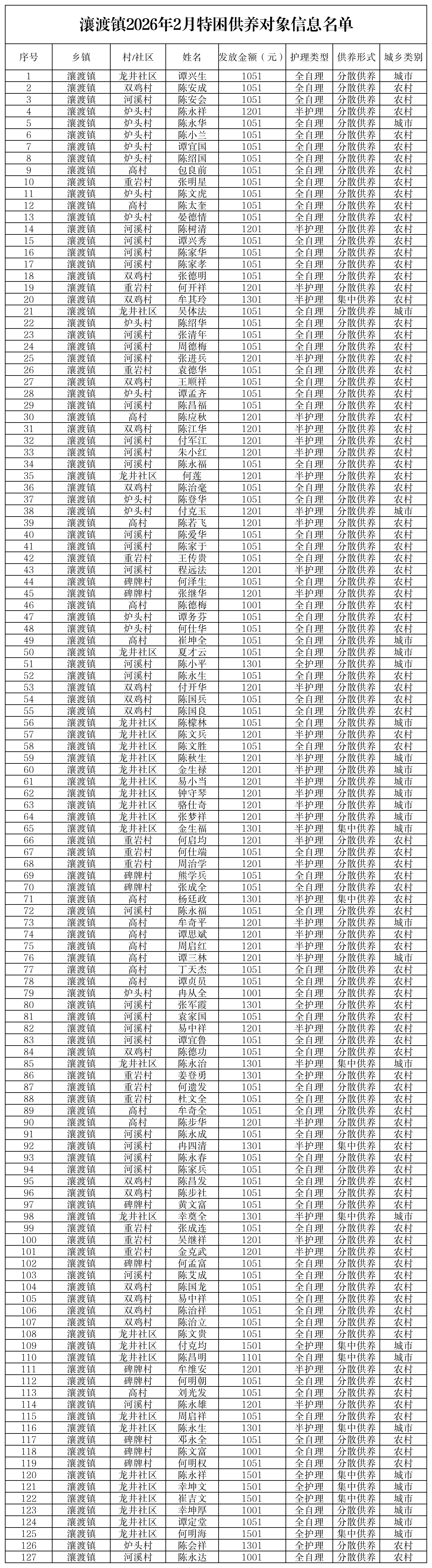 瀼渡镇2026年2月特困供养对象信息公示
