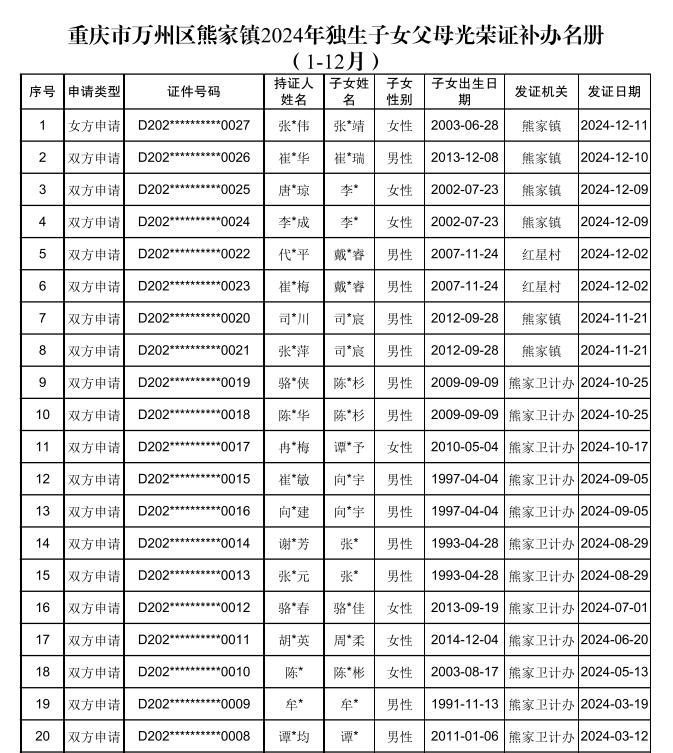 在线博彩平台 熊家镇2024年独生子女父母光荣证补办名册(1-12月)