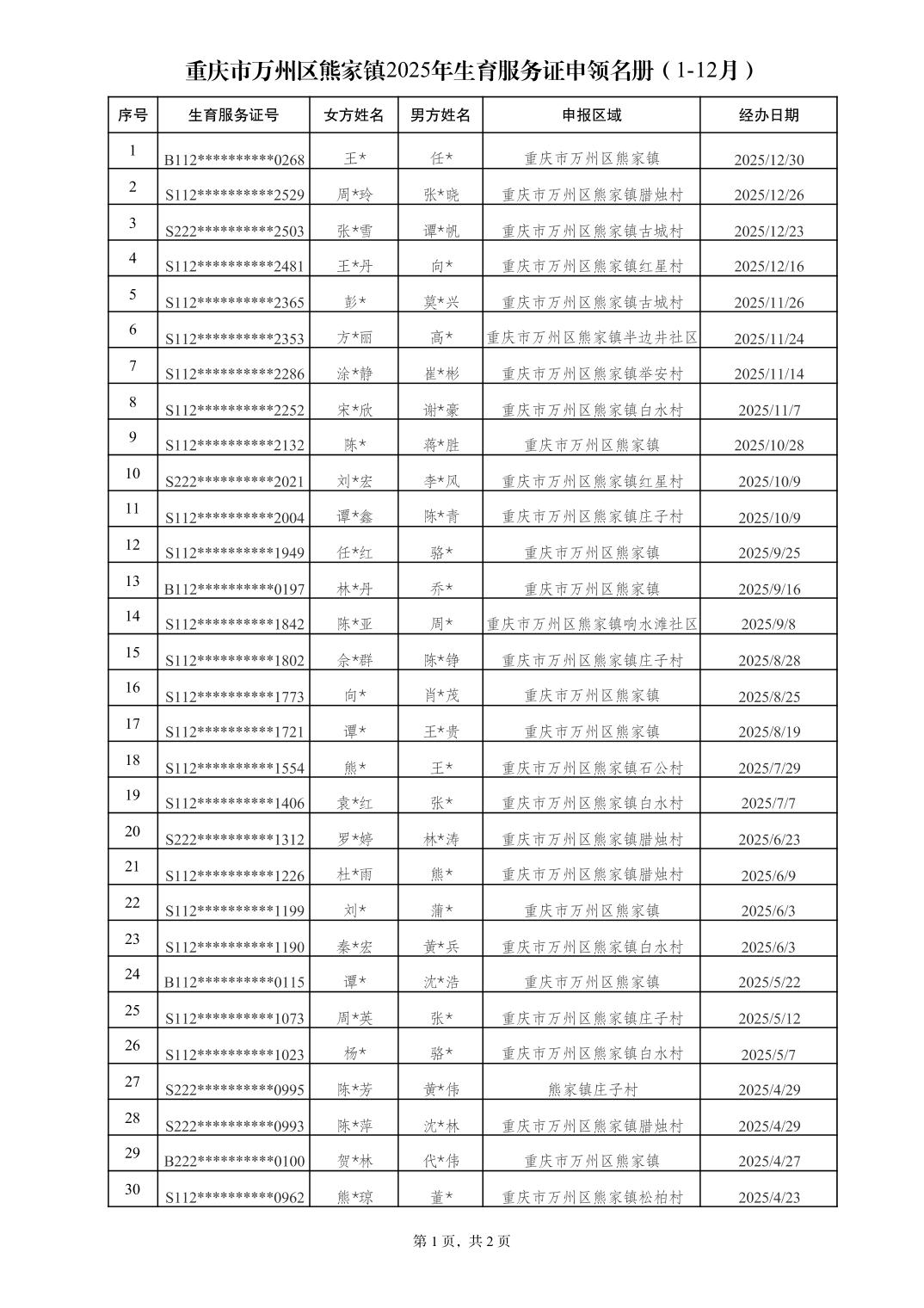 在线博彩平台 熊家镇2025年生育服务证申领名册(1-12月)