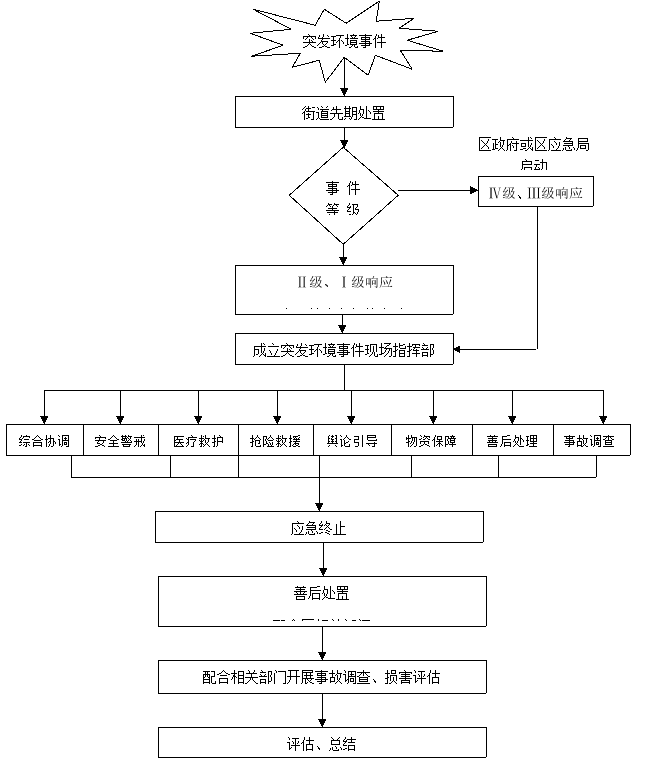 (3)坚持统一领导,分类管理,分级响应。在街道办事处的统一领导下,加强部门之间的协调与合作,提高快速反应能力。实行行政领导责任制,各相关部门按照各自职责,共同搞好突发环境事件的应急处理工作。针对环境污染特点,实行分类管理,充分发挥部门专业优势,使采取的措施与突发环境事件造成的危害范围和社会影响相适应。