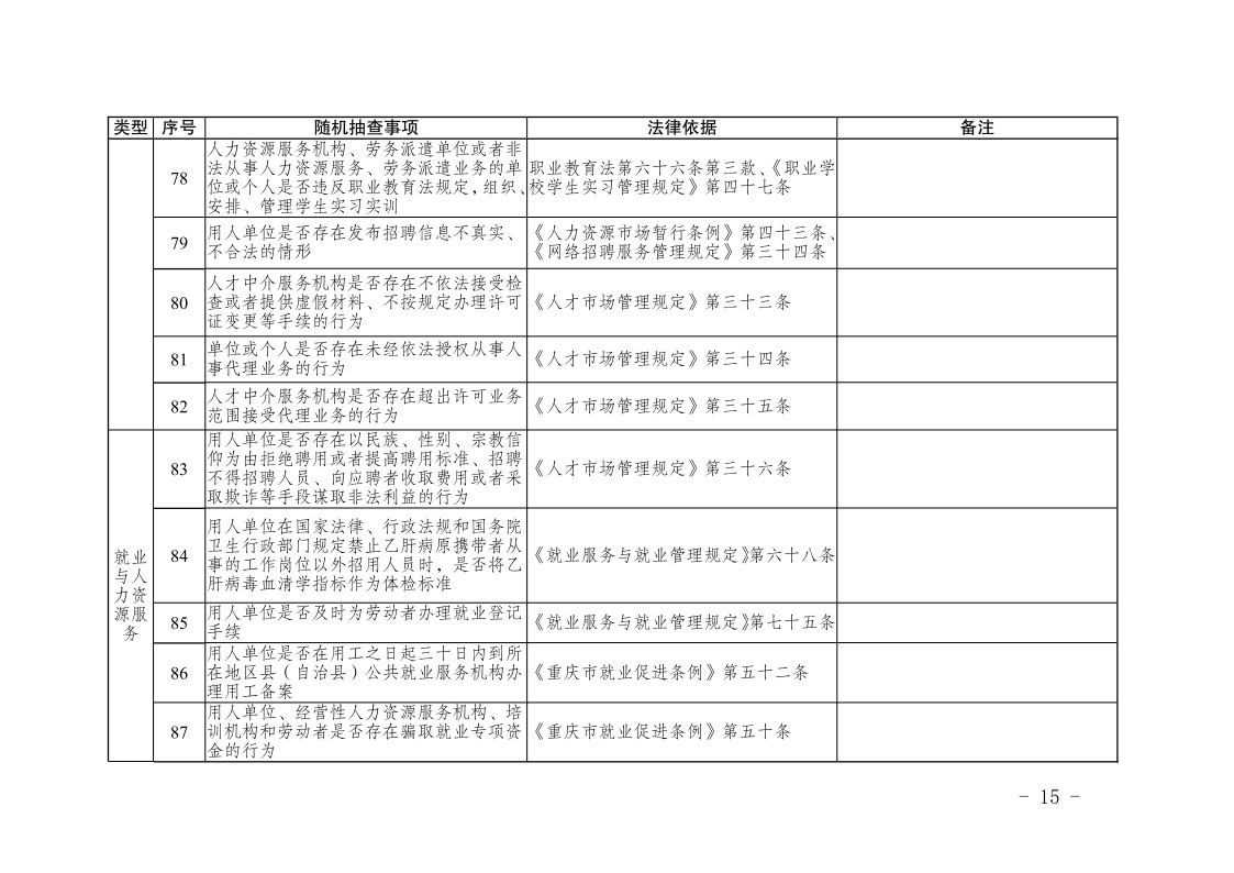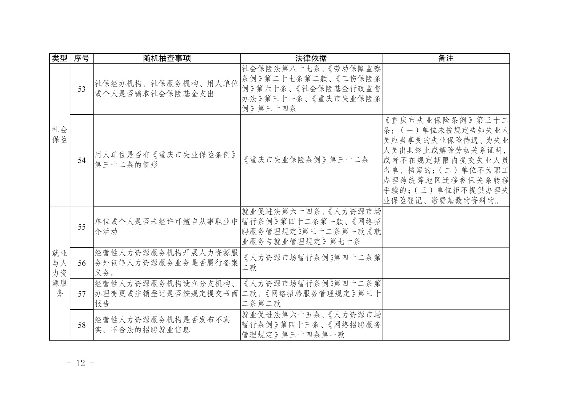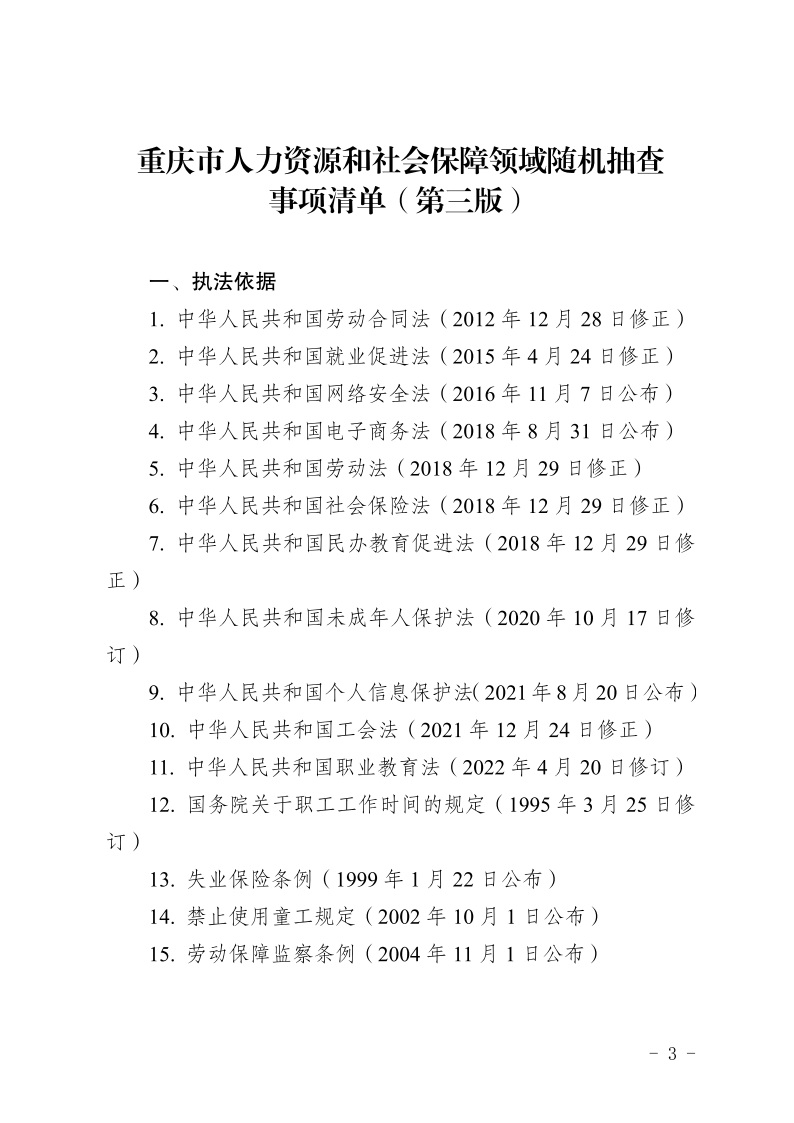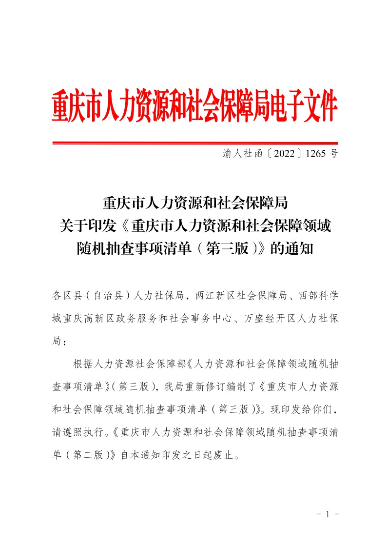重庆市人力资源和社会保障局关于印发《重庆市人力资源和社会保障领域随机抽查事项清单(第三版)》的通知