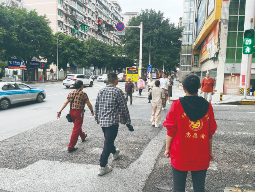 志愿者在路口引导行人过马路。